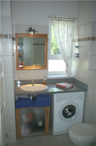 Badezimmer Das Badezimmer ist zwar nicht riesig, aber zweckmäßig und funktionell mit einer Badewanne und einer Dusche (inkl. Duschkabine) ausgestattet. Ferner ist im Badezimmer eine Waschmaschine untergebracht. |