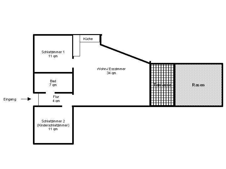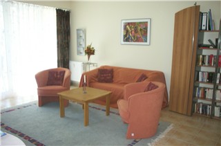 Wohnzimmer Das Wohnzimmer ist sehr großzügig und hell und geht in den Essbereich über, an den sich die Küche anschließt. Eine breite Terrassentür führt in den Garten hinaus. Zusätzlich befindet sich in dem Wohnzimmer eine Stereoanlage, ein Farbfernseher und ein Videorecorder. |