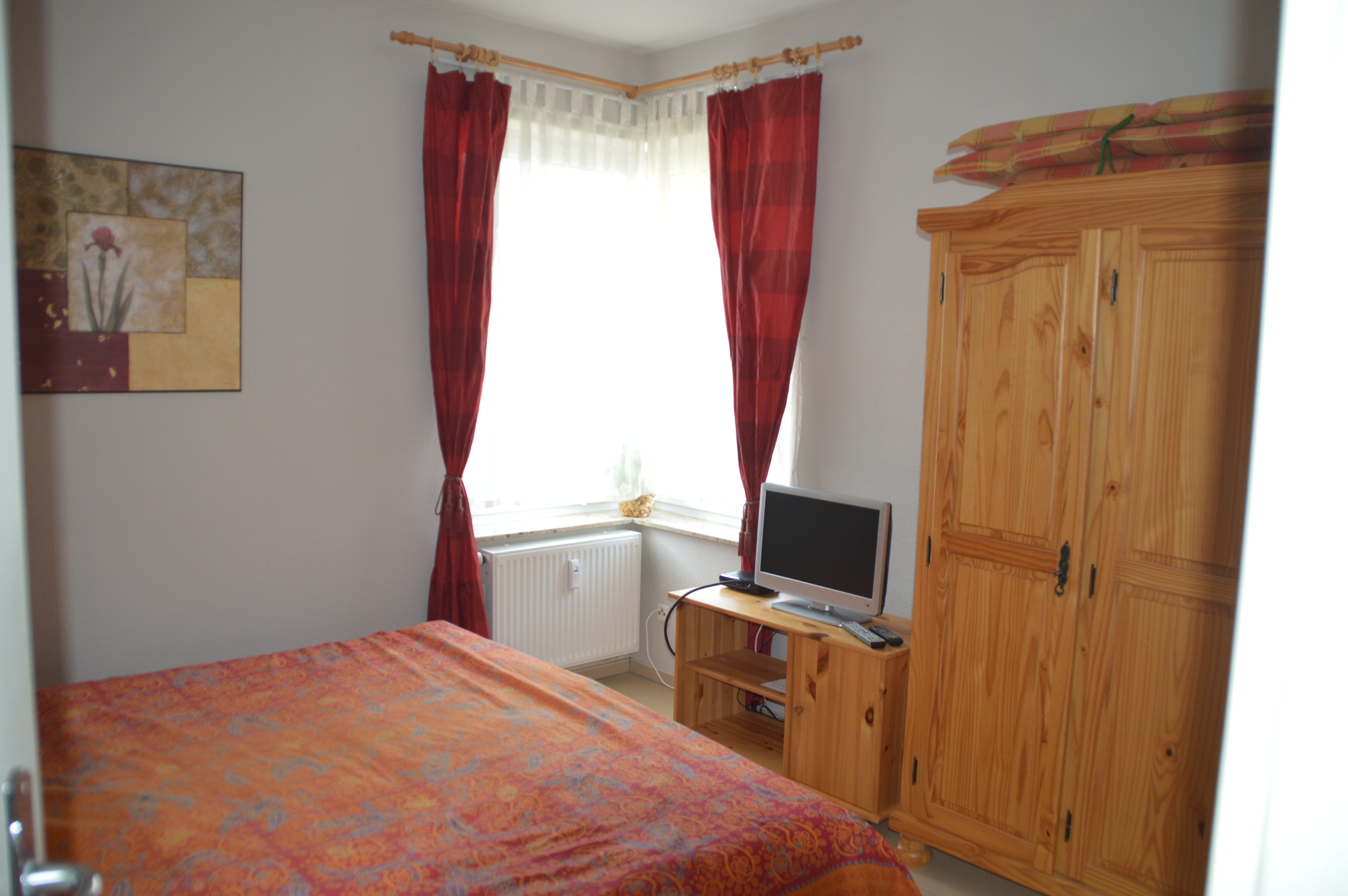 1. Schlafzimmer Das Schlafzimmer ist mit hochwertigem Teppichboden, einem Doppelbett, Nachttischschränkchen (inkl. Nachttischlampen) und einem geräumigen Schrank ausgestattet. Vom Schlafzimmer aus blickt man direkt ins Grüne. |