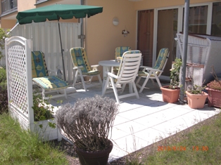 Terrasse Die sonnige Terrasse ist direkt vom Wohnzimmer über eine große Tür erreichbar. Dort steht - mit Sichtschutzelementen geschützt - neben einem Strandkorb ein großer Tisch mit vier Stühlen, zwei Liegestühle, eine Liege und ein Sonnenschirm zur Verfügung. |